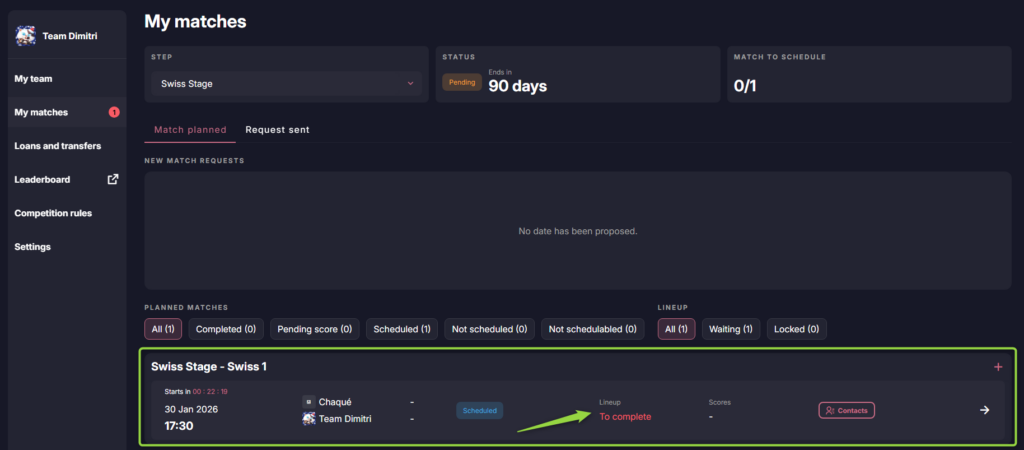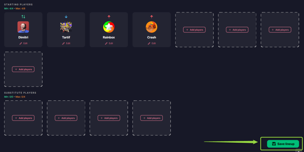 N’oubliez pas de sauvegarder la lineup. Vous pourrez venir la modifier si besoin dans le délai imparti avant le match défini par les organisateurs de la compétition.