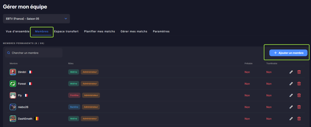 Vous pouvez ajouter vos coéquipiers, via Ajouter un membre, en utilisant leur nom d’utilisateur sur la plateforme. Vous trouverez ce nom d’utilisateur sur la page de profil du joueur — par exemple : Forest#93179.