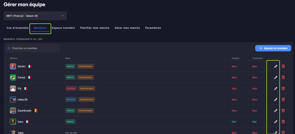 Dans Gestion de l’équipe, la section Membres, un bouton modifier sur chaque membre permet de réaliser l’opération.