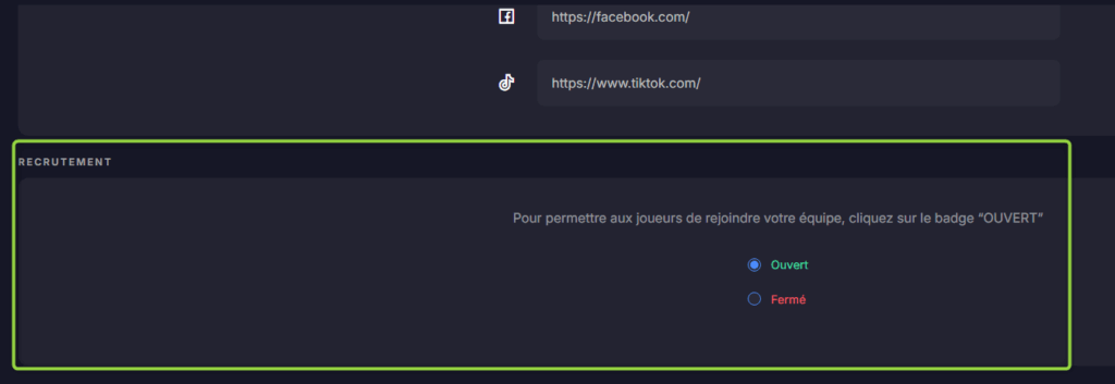 Cela permet d’annoncer que l’équipe recherche de nouveaux joueurs et de laisser les intéressés postuler. Vous pourrez ensuite gérer le recrutement en contactant les joueurs sur Discord et faire le try-out avant de les accepter ou refuser dans votre équipe sur la plateforme.