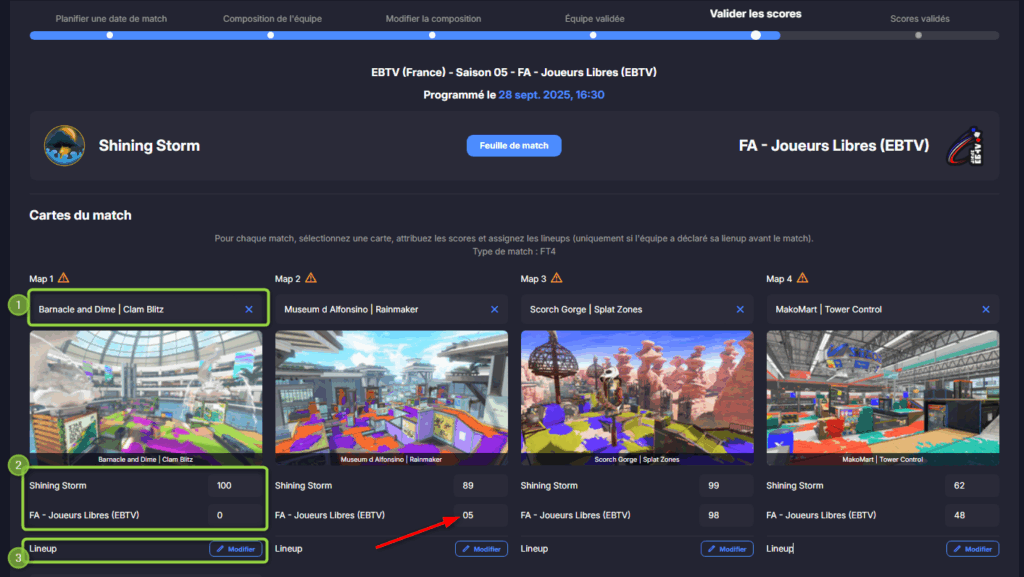La déclaration de line-up est à réaliser par les capitaines des équipes et ne peut en aucun cas être réalisé par les organisateurs de la compétition. Nous comptons sur vous pour la faire avant chaque match pour participer à la mise en avant complète de vos équipes et de la compétition 🦾