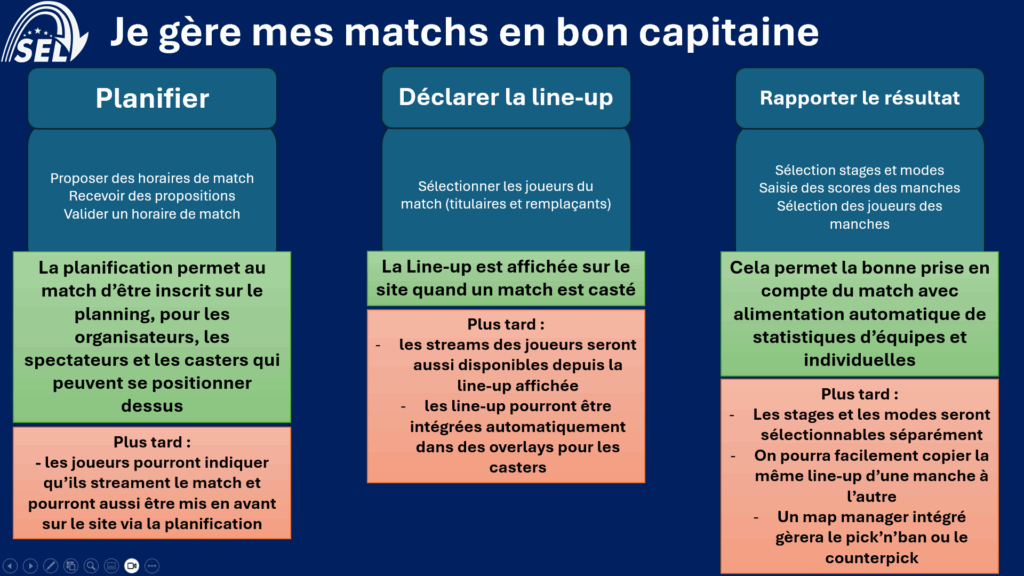 Evidemment la discussion sur Discord reste possible aussi, avant de valider la planification du match sur SEL. Une fois validée, le match apparaît directement sur le planning permettant aux suiveurs de la compétition d’être au courant et aux casters de se positionner pour diffuser votre match ! Il est donc important de bien planifier le match sur la plateforme.